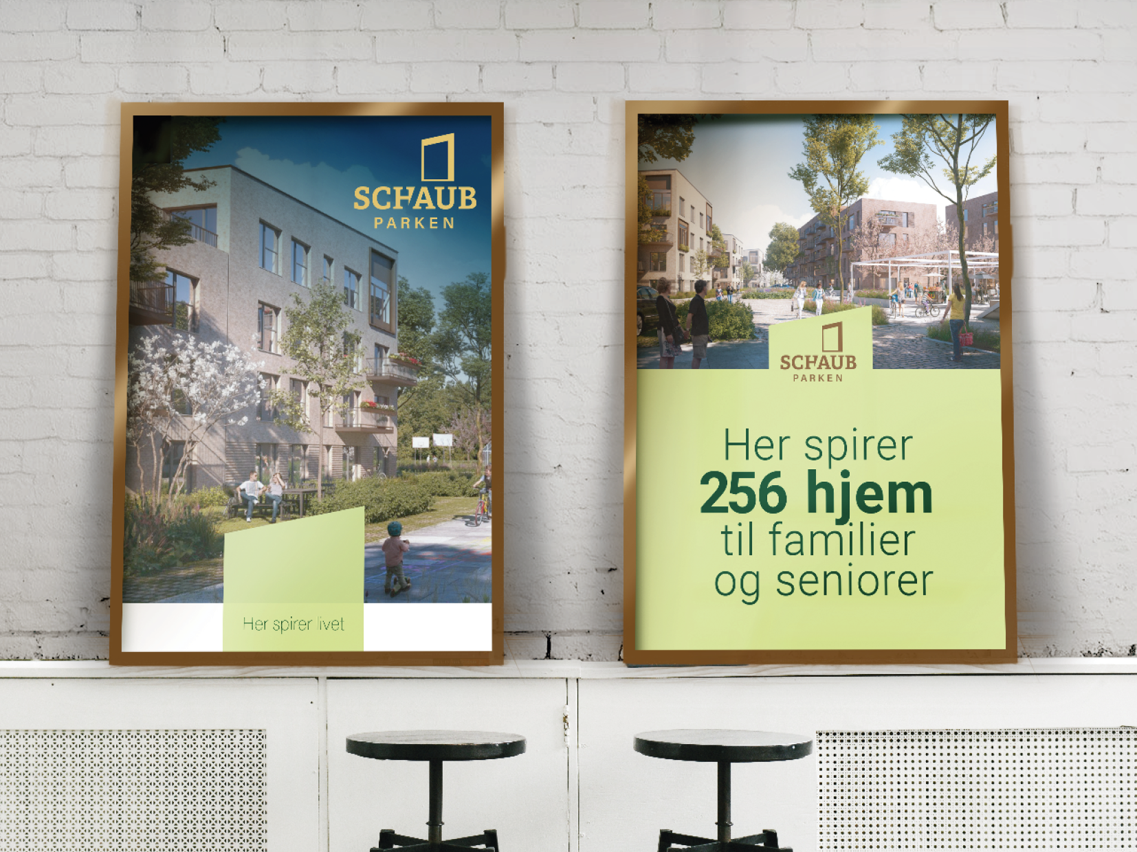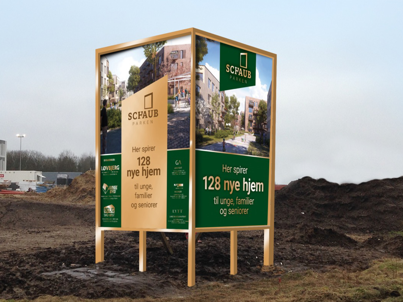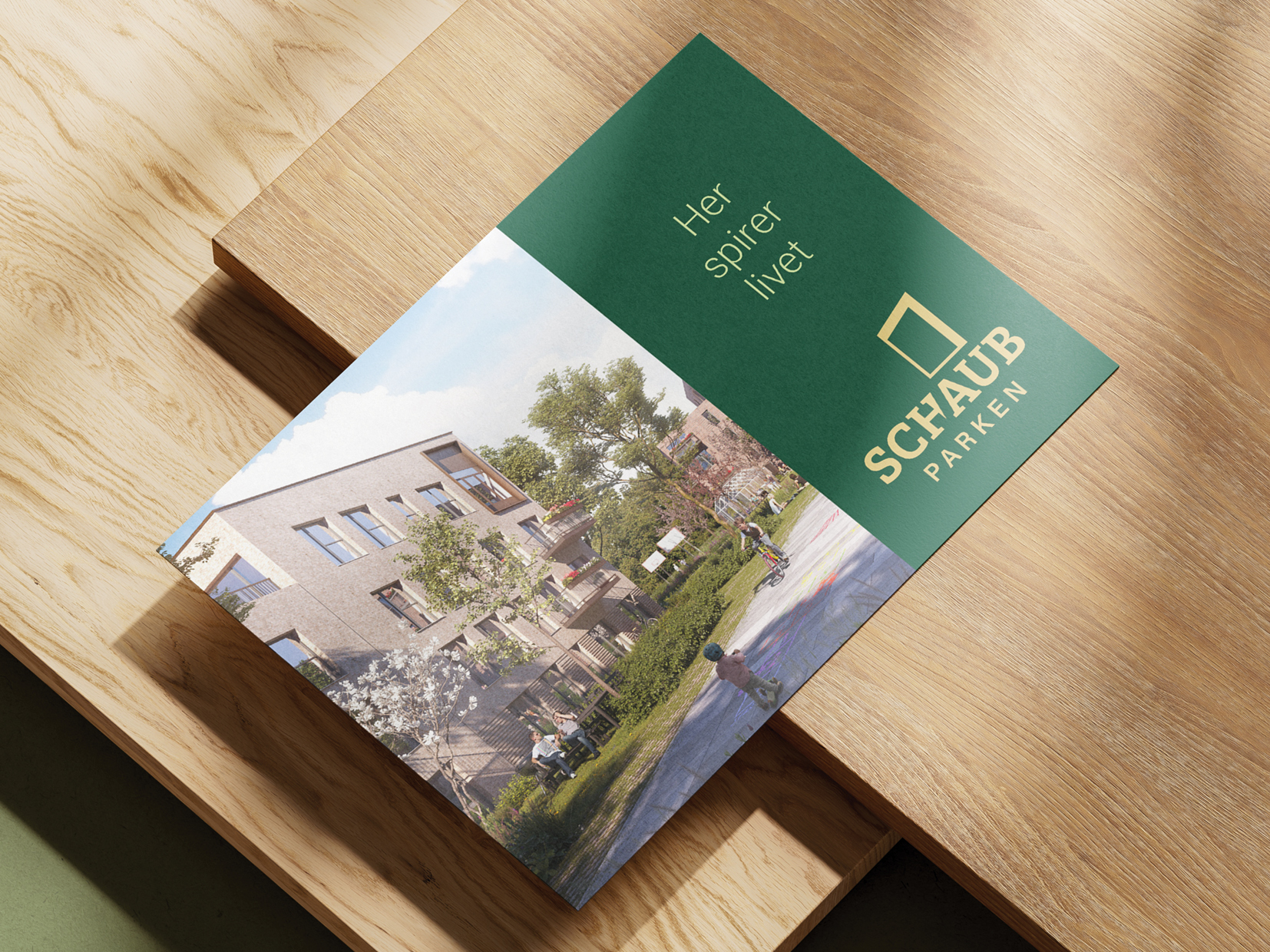 SchaubParken er et CO2-neutralt byudviklingsprojekt i Esbjerg, og vores opgave var at give projektet et visuelt udtryk, der både kunne signalere ambitionerne og fungere i praksis, hele vejen fra plan til virkelighed.